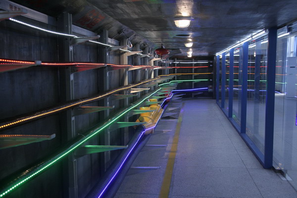电力电缆隧道实训室位于实训辅助楼二楼,面积120平方米,隧道长度18米, 宽度2米,高度2米,隧道内设有圆形电缆隧道(2米)、方形电缆隧道(2米),电力电缆敷设在隧道内,控制通讯电缆和4层电力电缆架(角钢支架)(0.4KV,10KV,35KV,110KV各一层,每根20米)、同时有2米直埋时铺设区。隧道内有防火墙,天井,通风系统,接地。隧道内装有防爆照明灯。为了便于实训和参观电缆隧内部结构,电缆外墙为10mm强化防爆玻璃。可进行初级工入职培训、中级工技能培训、高级工技能提高培训。