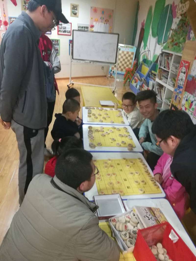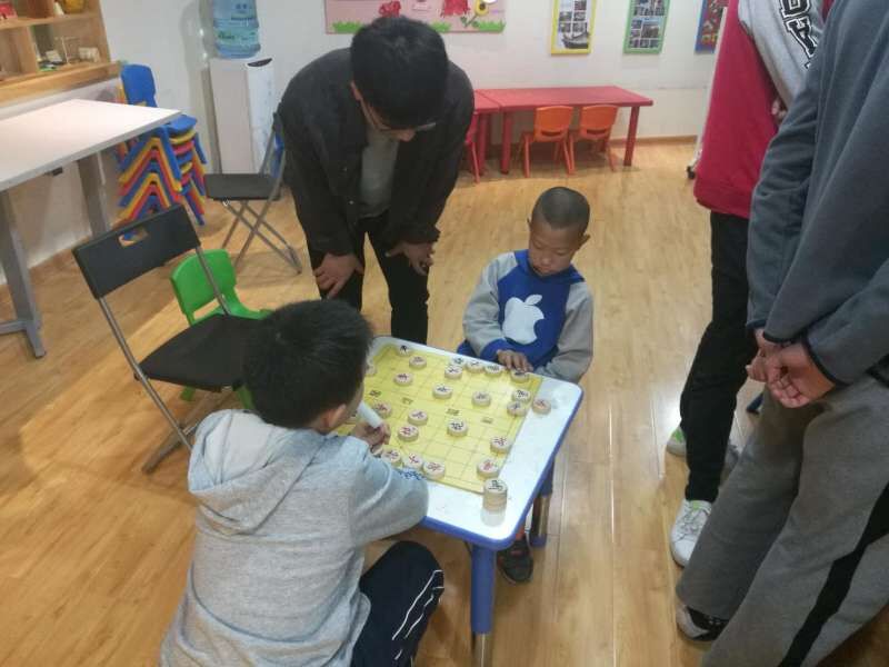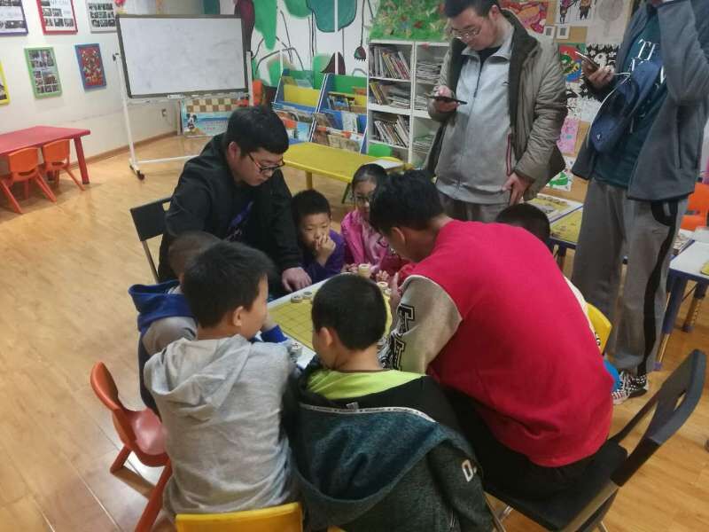首先,我们教导小朋友们认识每一个棋子的摆放位置和名字。然后,我们教导小朋友们了解每一个棋子在棋盘中的走法及其作用。在小朋友们的大体认识后,我们展开了下一步的教导,也就是我们此次活动的最后一个计划。我们七名志愿者和八位小朋友分为四组,小朋友们两两对决,我们志愿者则负责指导他们如何在比赛中熟练的掌握每一个棋子的走法及作用,与一些下象棋的棋路技巧,并且不断地纠正他们在比赛时出现的错误。