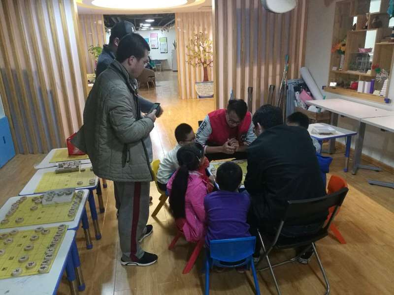 教导开始前我们将小朋友们聚集在一起,然后我们在中间的桌子上摆放了一盘象棋,让小朋友们围绕桌子坐下后,展开了我们此次的“青春驿站象棋教导”活动。
