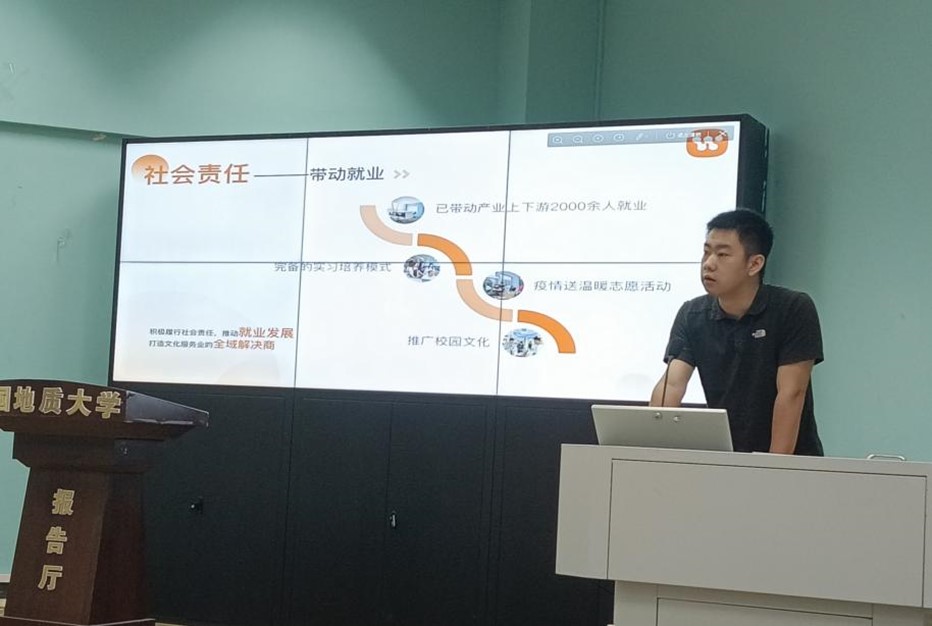 然后,taptap艺术与传媒学院大四学生李乐介绍了他创办的武汉松木文化科技有限责任公司的基本情况,包括公司结构、主营业务和社会责任等,并具体说明了该公司如何在文创链方面进行创新,如何在地大校园打造“地心引力”这一高校文创品牌更好地服务广大师生及校友,如何依托公司实际运营业绩积极备战“互联网+”、“三创赛”,这些都引发了同学们的积极思考。