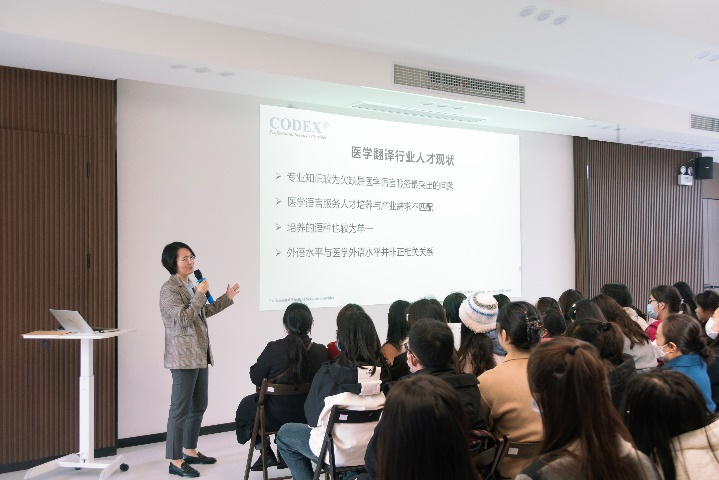 北京科译翻译公司武汉分公司总经理张晓星、人力资源部总监胡丽君、其他相关部门负责人及外籍专家结合该公司多年来在医药领域的语言服务经历,围绕医药翻译领域的概况、发展方向、人才现状、质量标准等为大家进行讲解。讲解结束后,同学们还现场试译了一段医学专业内容。接下来,同学们在工作人员带领下进行了参观,沉浸式了解语言服务公司的工作环境和服务流程。