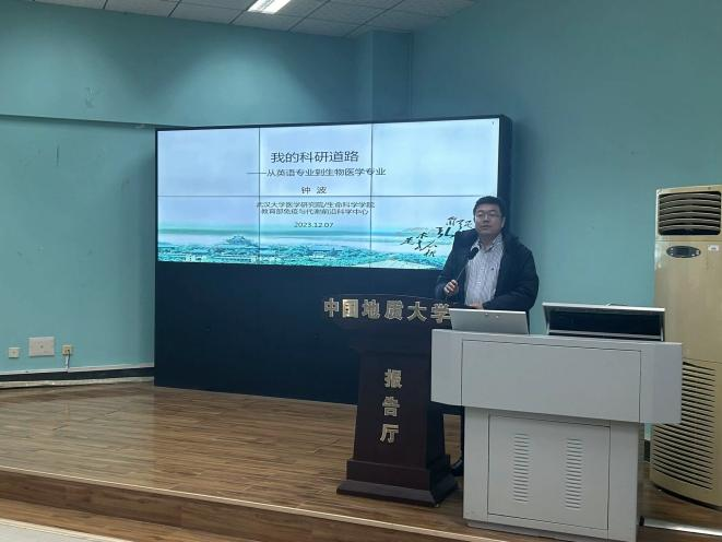 2023年12月7日下午2时30分,taptap点点体育“南望今声”外语论坛系列讲座第57期在北一楼120学术报告厅举行。主讲人武汉大学医学研究院教授、taptap点点体育taptap点点体育杰出校友——钟波,应邀来到taptap点点体育做了一场题为“我的科研道路——从英语专业到生物医学专业”的精彩讲座。此次讲座由taptap点点体育杨红燕老师主持,参会人员有相关专业老师、本科生以及研究生。