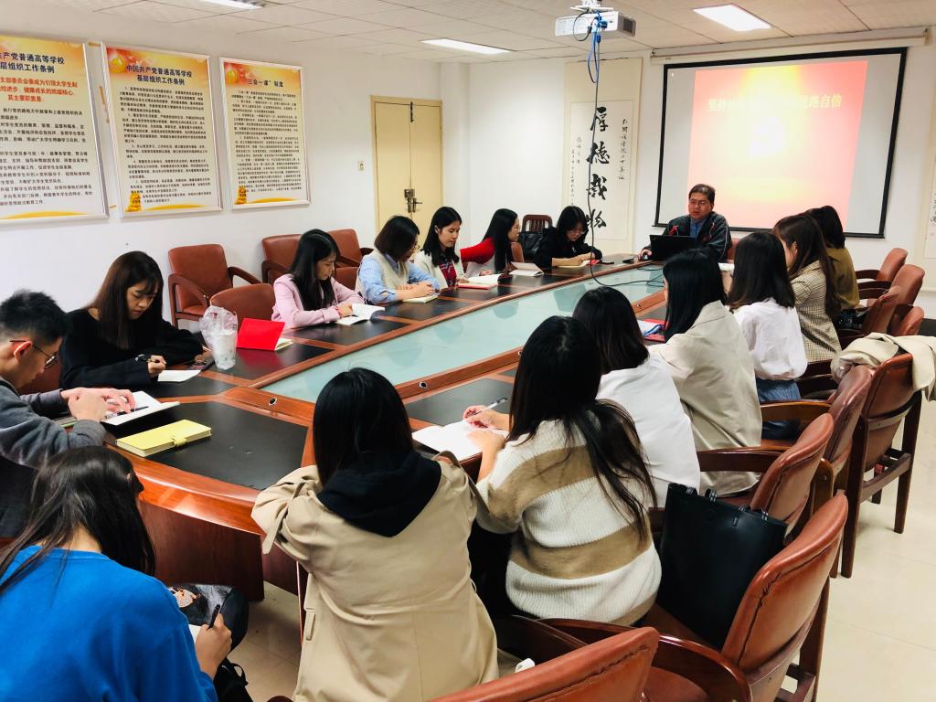 2019年10月29日下午2:30,taptap点点体育“不忘初心·牢记使命”主题教育系列党课在北一楼339正式开讲,学院党委副书记胡文勤为全院研究生党员讲授了题为“坚持社会主义,增强道路自信”的党课。