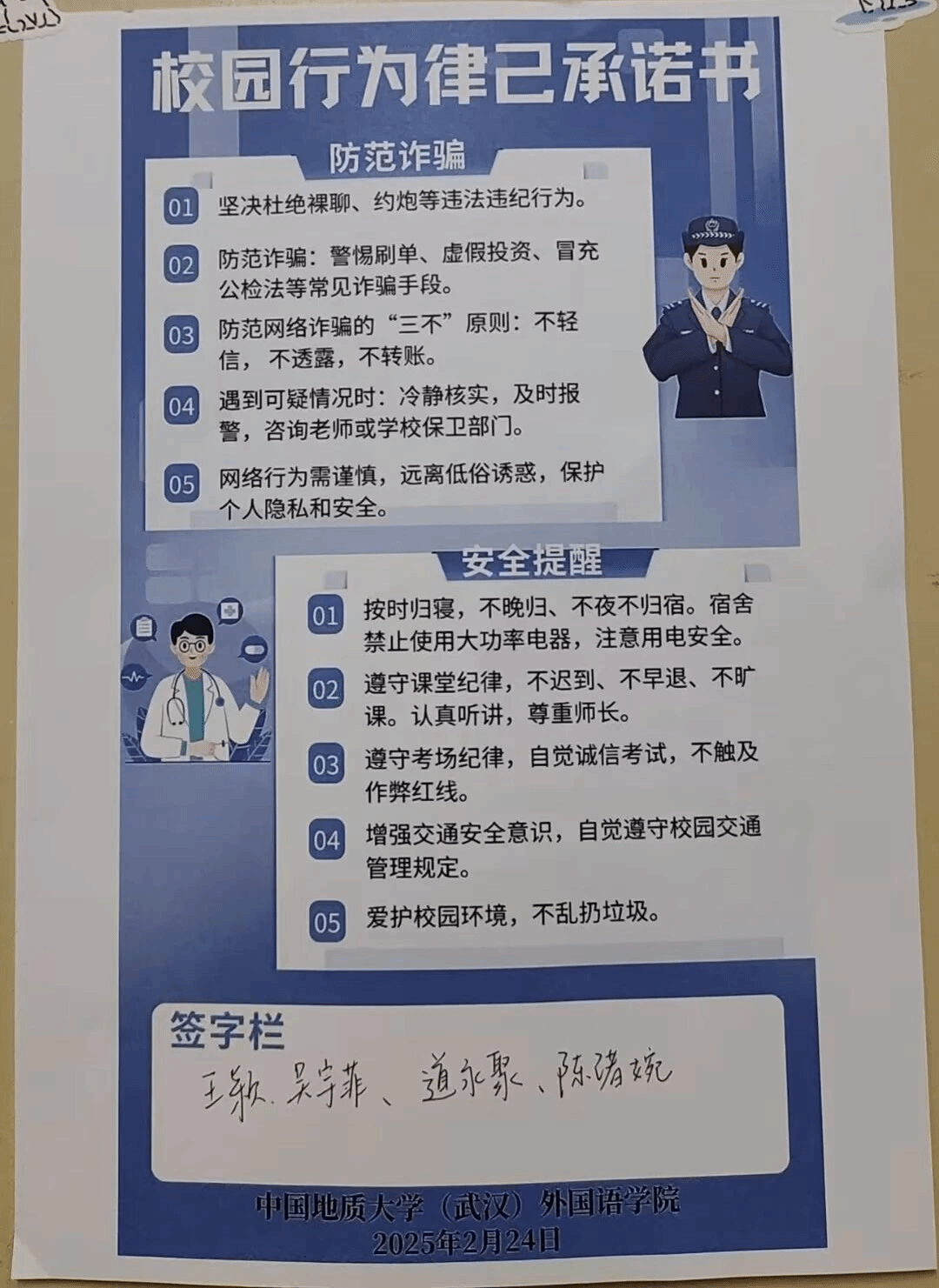 taptap点点体育本研学生积极参与本次活动,校园行为律己承诺书发放到寝室后,同学们以寝室为单位进行承诺书的研读和学习探讨,明确了新学期学习生活律己要求,熟读了反诈提醒与安全建议,进行了深入的反思与学习,并郑重地在承诺书签字栏处留下签名,表达了对校园安全稳定的支持与承诺。这一活动不仅增强了学生的自律意识,也进一步凝聚了集体力量,为构建安全和谐的校园环境奠定了坚实基础。