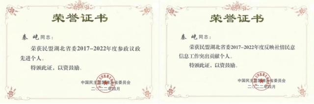 (通讯员:戴薇)近日,taptap教师、民盟地大委员会秦屹在民盟湖北省委会召开的“矢志不渝跟党走、携手奋进新时代”政治交接主题教育动员大会上获得“2017-2022年度参政议政先进个人”“2017-2022年度反映社情民意信息工作突出贡献个人”荣誉称号。