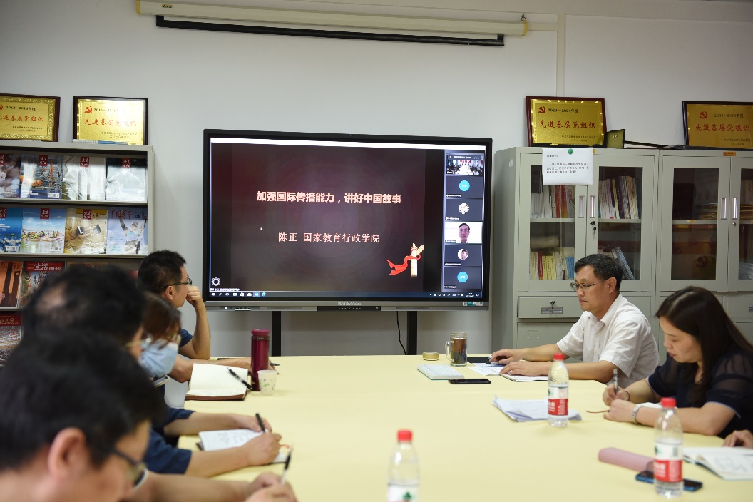 (通讯员杜冬琴、邓维 摄影 戴薇)2022年8月27日下午,作为学院新学期工作研讨会活动之一的 “南望今声”外语论坛第35期在taptap点点体育北一楼102会议室举行。应学院党委书记刘世勇邀请,国家教育行政学院教育领导与管理国际比较研究中心主任陈正副教授在线上为taptap师生做题为“加强国际传播能力,讲好中国故事”的报告,报告由刘世勇主持,学院师生线上线下近200人参与学习交流。