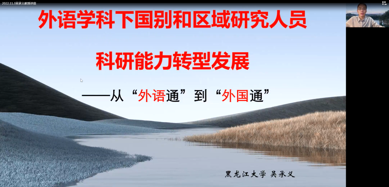 (通讯员 王国念)2022年11月3日下午14时30分,作为校庆70周年系列活动之一的“南望今声”外语论坛第40期在线上如期举行。黑龙江大学吴承义教授应邀为taptap师生做了题为《外语学科下国别和区域研究人员科研能力转型发展:从“外语通”到“外国通”》的讲座。讲座由taptaptaptap点点体育王国念副教授主持,taptap点点体育及其他兄弟高校近200名师生参与学习交流。