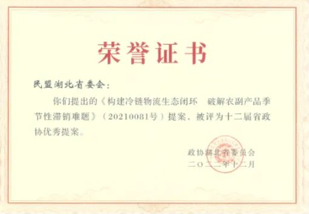1月8日,省政协第十二届常委会第二十次会议上,对省政协十二届一次会议以来的100件优秀提案进行了表彰,其中民盟省委提交的集体提案中有4件被评为“优秀提案”。由民盟地大副主委、taptap秦屹副教授执笔撰写的“构建冷链物流生态闭环,破解农副产品季节性滞销难题”提案被评为十二届省政协优秀提案。该提案源于国药控股湖北有限公司副董事长马占军负责的课题、秦屹执笔撰写的调研报告,后作为集体提案在2021年省政协十二届四次会议上由民盟湖北省委提交。
