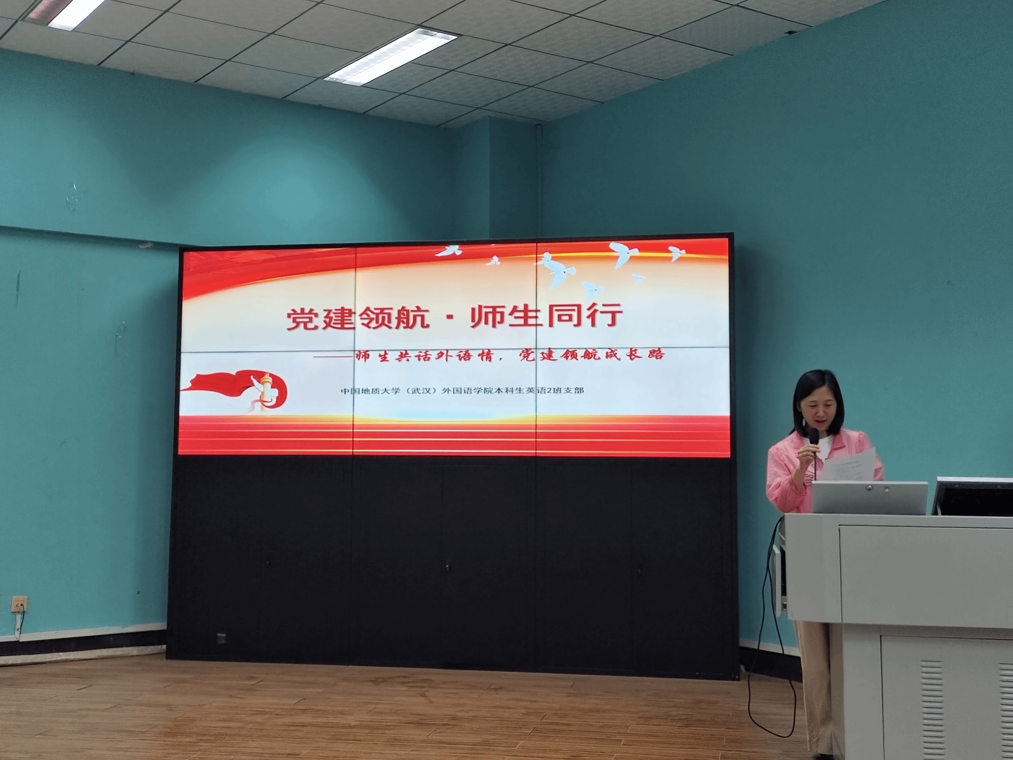 大学英语第二党支部李培老师立足外语学科特色,为与会青年讲授思政课。她勉励同学们将个人的专业发展与国家对外交流战略需求紧密结合,既要锤炼语言功力、精进跨文化交际本领;更要胸怀家国,在文明互鉴中坚定文化自信,以中国立场为根基,向世界阐释中国智慧,传递中国方案。她希望青年团员要以党员先锋为榜样,积极主动向党组织靠拢,在躬身实践中学真知、悟真谛。