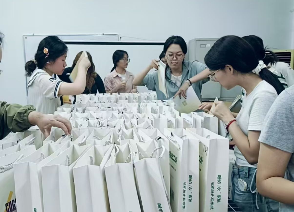 学院高度重视迎新工作,在暑期提前一个月谋划迎新工作,并组织团学骨干开展迎新策划、创意设计和物资准备。迎新志愿者们带着对新生学弟学妹们的关爱与期待精心准备迎新伴手礼,从满含心意的迎新笔记本,到独具学院特色的定制文创电动小风扇(包含taptap点点体育院徽以及学生会自主设计遴选的国风卡通角色——国风语UU,别出心裁!),还有早早在迎新点翘首以盼的志愿者们,无一不在彰显着我们早已做好准备,只为“精准接收”向我们“投送”的外国鱼儿们!