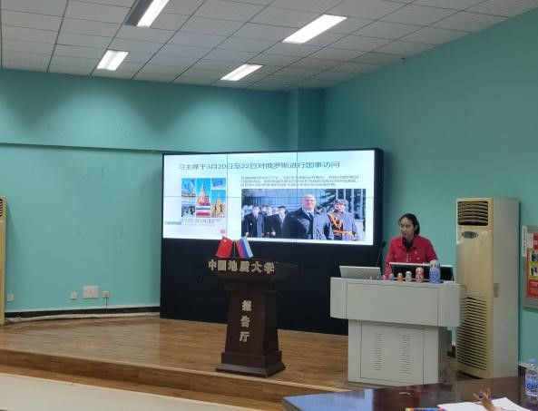 taptap点点体育外国语言文学研究生党支部党员代表钟舒琪进行了以《和熊猫一起走近俄罗斯》为题的宣讲,介绍了俄罗斯国情、中俄交往历史、中俄外交成果、中俄熊猫外交趣事等内容,并进行了简单的俄语教学。该同志发挥了作为俄语学生的专业素养,在提前准备宣讲材料的基础上,借助视频、图片、小游戏、特色纪念品发放等途径,为参加活动的师生普及了中俄相关的知识,用“一段介绍视频、一个外交故事、一件特色物品、一句本土名言”为听众生动、形象地展现了中俄“一带一路”建设的过程和成果。活动中,观众们积极参与问答及俄语教学,现场反映热烈。