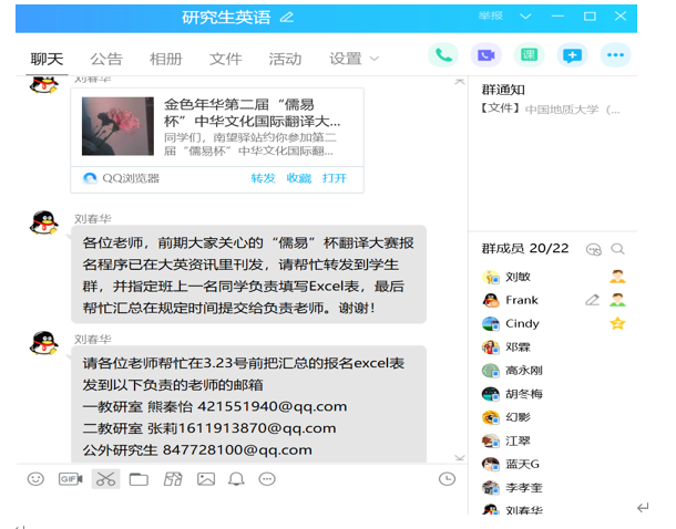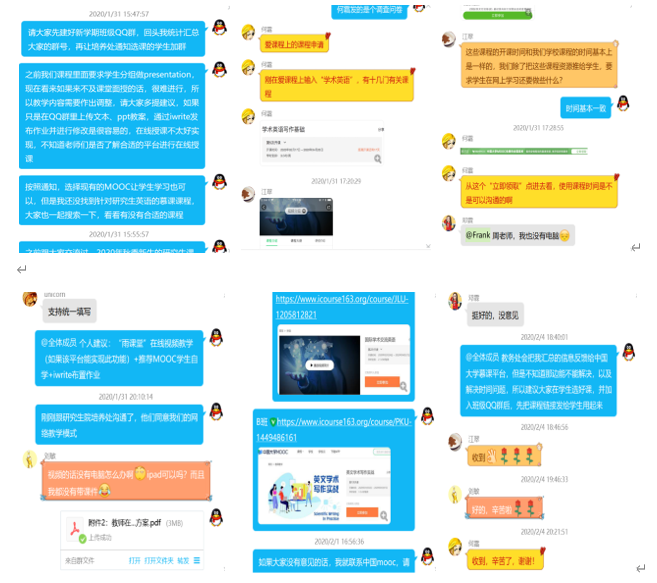 自1月30号开始,在校研究生院的具体要求和指导下,学院张基得书记、张峻峰院长高度重视,积极部署。承担taptap研究生公共英语教学的老师们充分利用原定返校开学日期前的时间,在QQ群里开展头脑风暴,充分讨论如何因地制宜地开展学习、教学和研究工作,迅速制定研究生科技英语写作与交流“一课一策”教学工作组织方案。